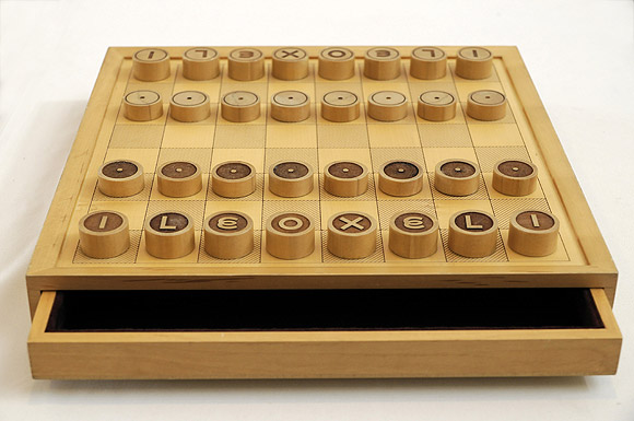 The symbols on the pieces on the home rank spell out the name of the game: OXELI.